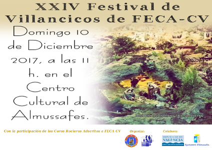 La Federación de Entidades Culturales Andaluzas en la Comunidad Valenciana, se complace en invitarles a su XXIV Festival de Villancicos, que se celebrará el próximo domingo 10 de Diciembre de 2017. a las 11:00h en el Centro Cultural de Almussafes, sito en la C/ Ausiàs March, 39 de Almussafes (46440) en la provincia de Valencia.